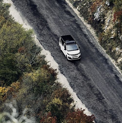 Unter dem Aufstelldach bietet ein bequemes Doppelbett ausreichend Platz für zwei Personen. Die Front lässt sich einfach öffnen – für unvergessliche Panoramablicke.
