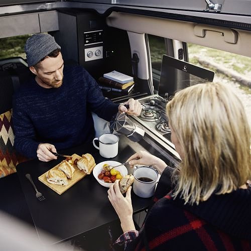 Dank der Bordküche mit Zwei-Flammen-Herd und Spülbecken kannst du auch auf Reisen lecker kochen – die Schubladen bieten genügend Platz für alle Utensilien.