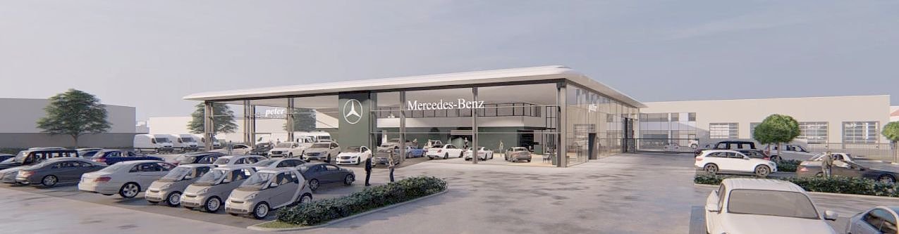 Nach modernster Mercedes-Benz-Markenarchitektur – die Farbe BLACK, riesige Bildschirme, Multimedia und digitale Interaktion sind dominierend – wie man sie auch aus dem Motorsport kennt, wird dem Verkauf und dem Service für Pkw, Transporter und Nutzfahrzeuge auf rund 4400 m² Nutzfläche ein zukunftsweisendes Domizil gegeben, das in seiner architektonischen Konzeption konsequent die vom Hersteller vorgeschriebene Trennung der Sparten Pkw/Van und Truck (Nutzfahrzeuge) umsetzt.