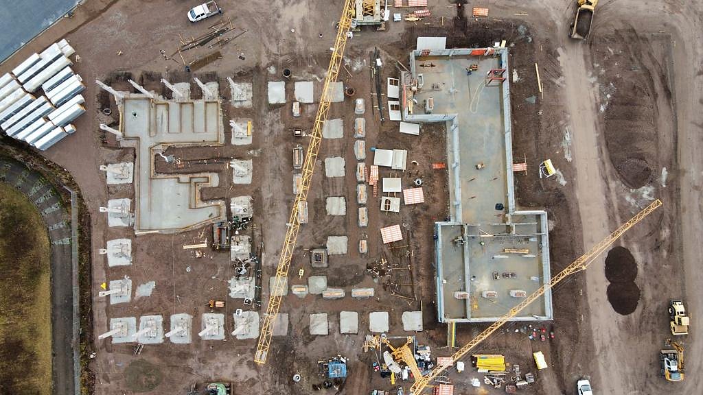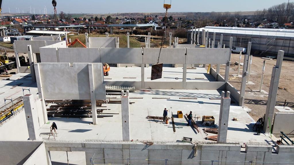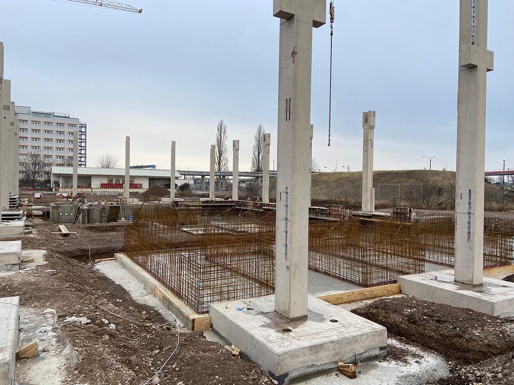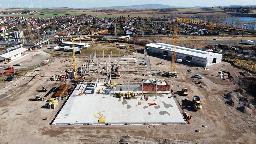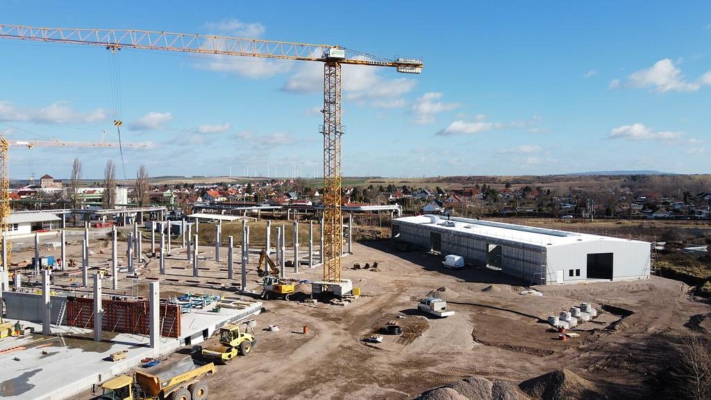 Noch befindet sich auf dem Gelände in Erfurt eine Großbaustelle. Seit kurzem läuft der Hochbau für das neue Automobile Dienstleistungszentrum und die Montage aller Betonfertigteile erfolgt. Somit nimmt das neue Autohaus weiter an Gestalt an.