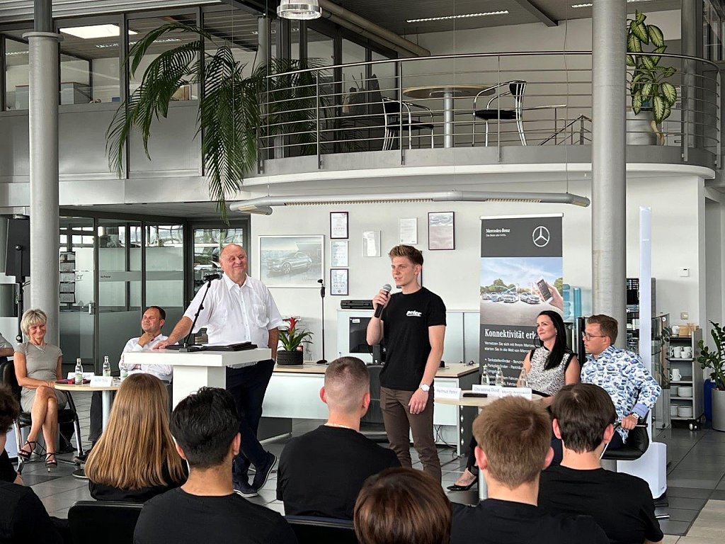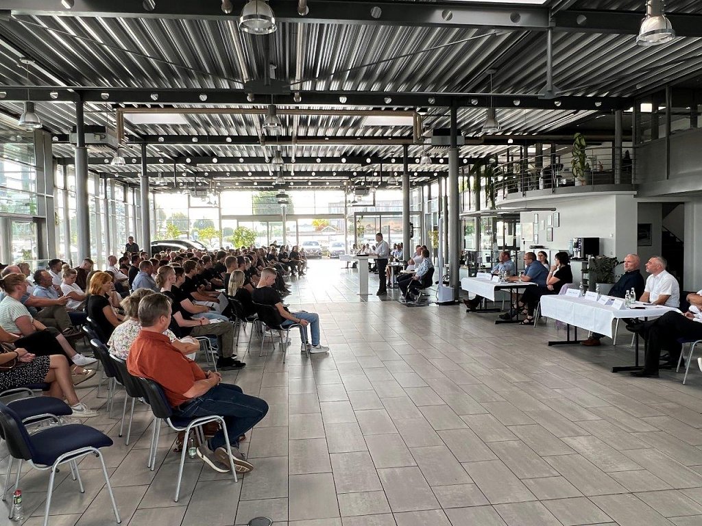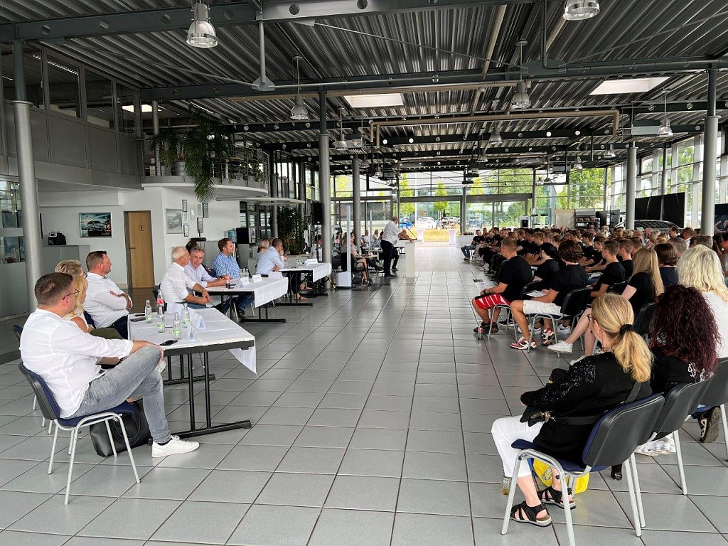 Am frühen Freitagabend hieß Helmut Peter 41 junge Menschen willkommen, von denen 28 ihre Ausbildung zum KFZ-Mechatroniker, 2 zum Lackierer und 11 zum Kaufmann für Büromanagement beginnen werden. Mit dabei: die Eltern der Neuen, die Peter-Geschäftsleitung sowie Pädagogen der Berufsschulen.