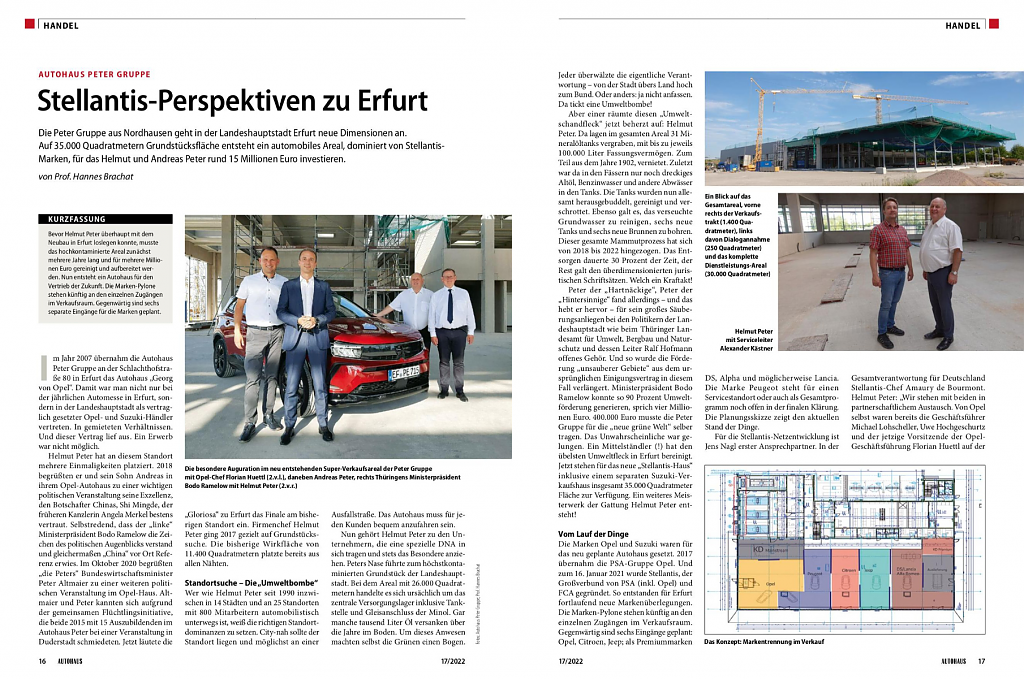 Peter der "Hartnäckige", Peter der "Hintersinnige" fand allerdings - und das hebt er hervor - für sein großes Säuberungsanliegen bei den Politikern der Landeshauptstadt wie beim Thüringer Landesamt für Umwelt, Bergbau und Naturschutz und dessen Leiter Ralf Hofmann offenes Gehör. Und so wurde die Förderung "unsauberer Gebiete" aus dem ursprünglichen Einigungsvertrag in diesem Fall verlängert. Ministerpräsident Bodo Ramelow konnte so 90 Prozent Umweltförderung generieren, sprich vier Millionen Euro. 400.000 Euro musste die Peter Gruppe für die "neue grüne Welt" selber tragen. Das Unwahrscheinliche war gelungen. Ein Mittelständler (!) hat den übelsten Umweltfleck in Erfurt bereinigt. Jetzt stehen für das neue "Stellantis-Haus" inklusive einem separaten Suzuki-Verkaufshaus insgesamt 35.000 Quadratmeter Fläche zur Verfügung. Ein weiteres Meisterwerk der Gattung Helmut Peter entsteht!