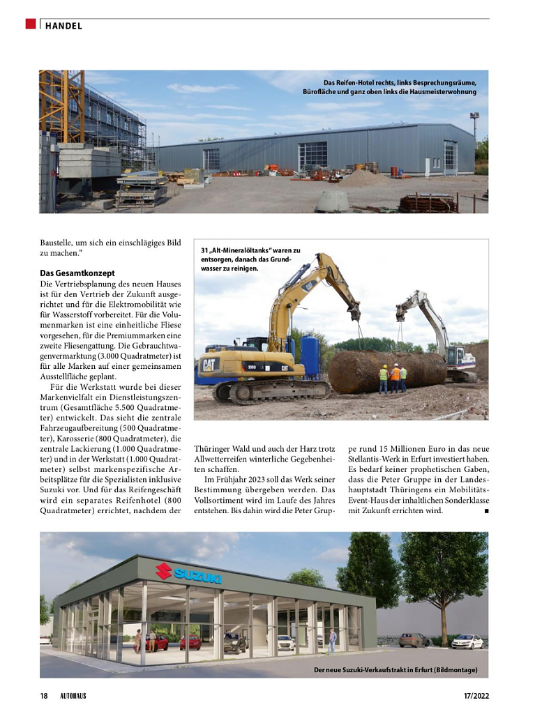 Im Frühjahr 2023 soll das Werk seiner Bestimmung übergeben werden. Das Vollsortiment wird im Laufe des Jahres entstehen. Bis dahin wird die Peter Gruppe rund 15 Millionen Euro in das neue Stellantis-Werk in Erfurt investiert haben. Es bedarf keiner prophetischen Gaben, dass die Peter Gruppe in der Landeshauptstadt Thüringens ein Mobilitäts-Event-Haus der inhaltlichen Sonderklasse mit Zukunft errichten wird.