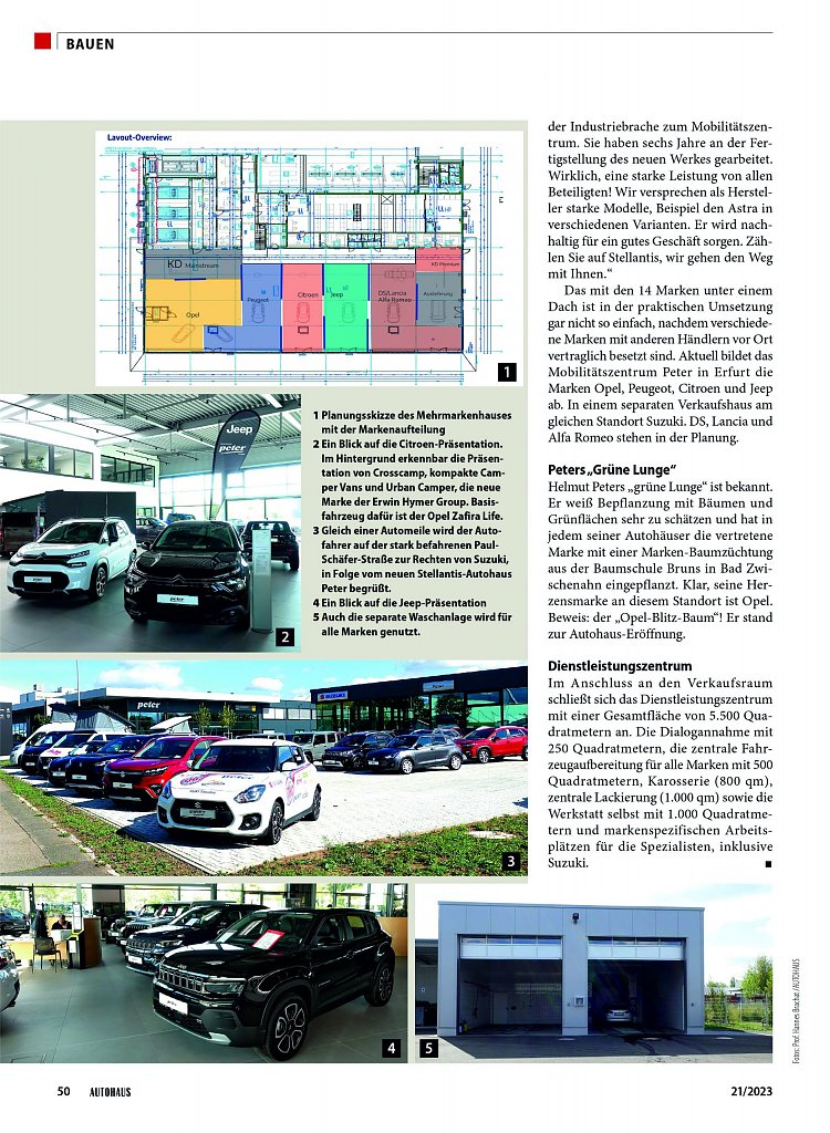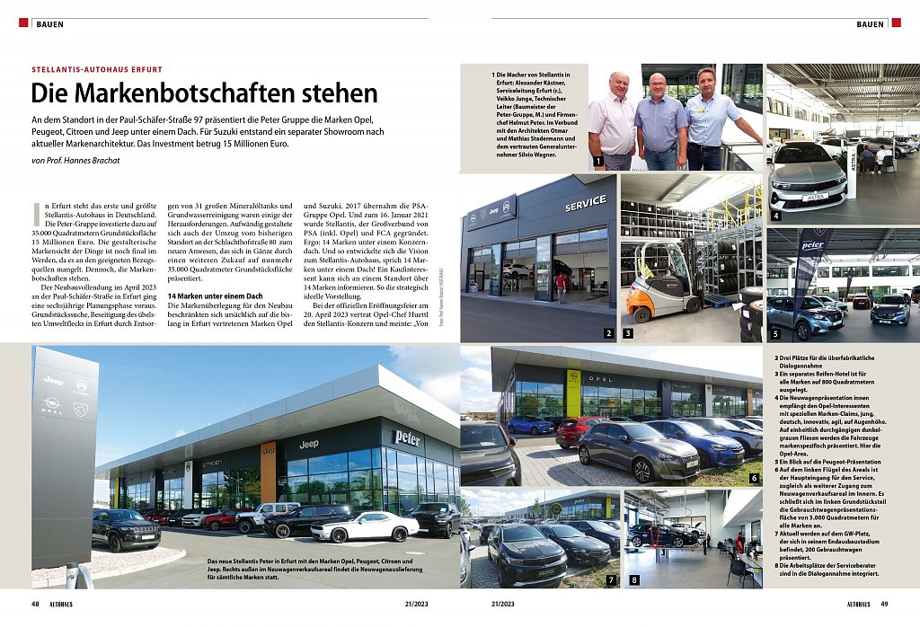 In Erfurt steht das erste und größte Stellantis-Autohaus in Deutschland. Die Peter-Gruppe investierte dazu auf 35.000 Quadratmetern Grundstücksfläche 15 Millionen Euro. Die gestalterische Markensicht der Dinge ist noch final im Werden, da es an den geeigneten Bezugsquellen mangelt. Dennoch, die Markenbotschaften stehen.Der Neubauvollendung im April 2023 an der Paul-Schäfer-Straße in Erfurt ging eine sechsjährige Planungsphase voraus. Grundstückssuche, Beseitigung des übelsten Umweltflecks in Erfurt durch Entsorgungen von 31 großen Mineralöltanks und Grundwasserreinigung waren einige der Herausforderungen. Aufwändig gestaltete sich auch der Umzug vom bisherigen Standort an der Schlachthofstraße 80 zum neuen Anwesen, das sich in Gänze durch einen weiteren Zukauf auf nunmehr 35.000 Quadratmeter Grundstücksfläche präsentiert.