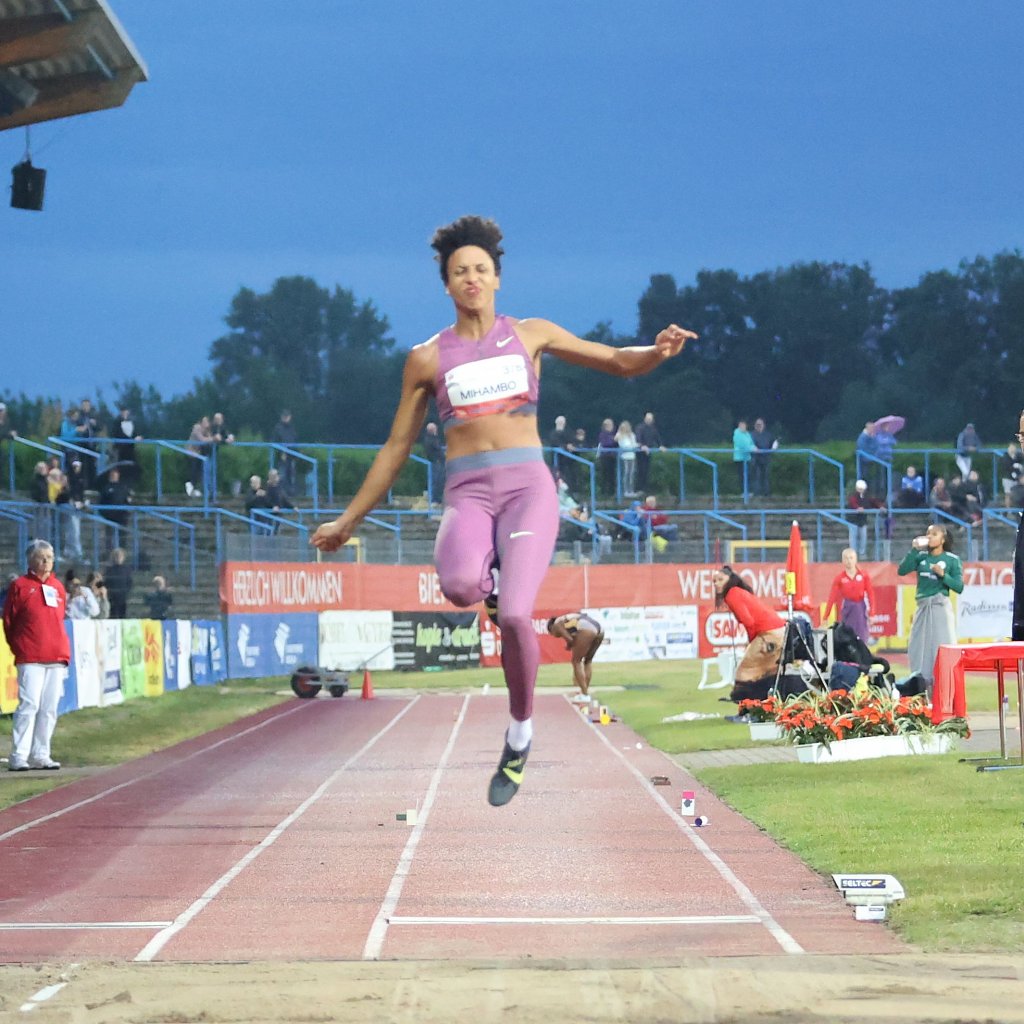Beim Weitsprung ließ sich die Olympiasiegerin Malaika Mihambo vom nassen Untergrund nicht beirren und erreichte im letzten Versuch mit 6,79 m den ersten Platz vor Natalie Linares aus Kolumbien mit 6,72 m. Dritte wurde mit 6,65 m Mikaelle Assani.
