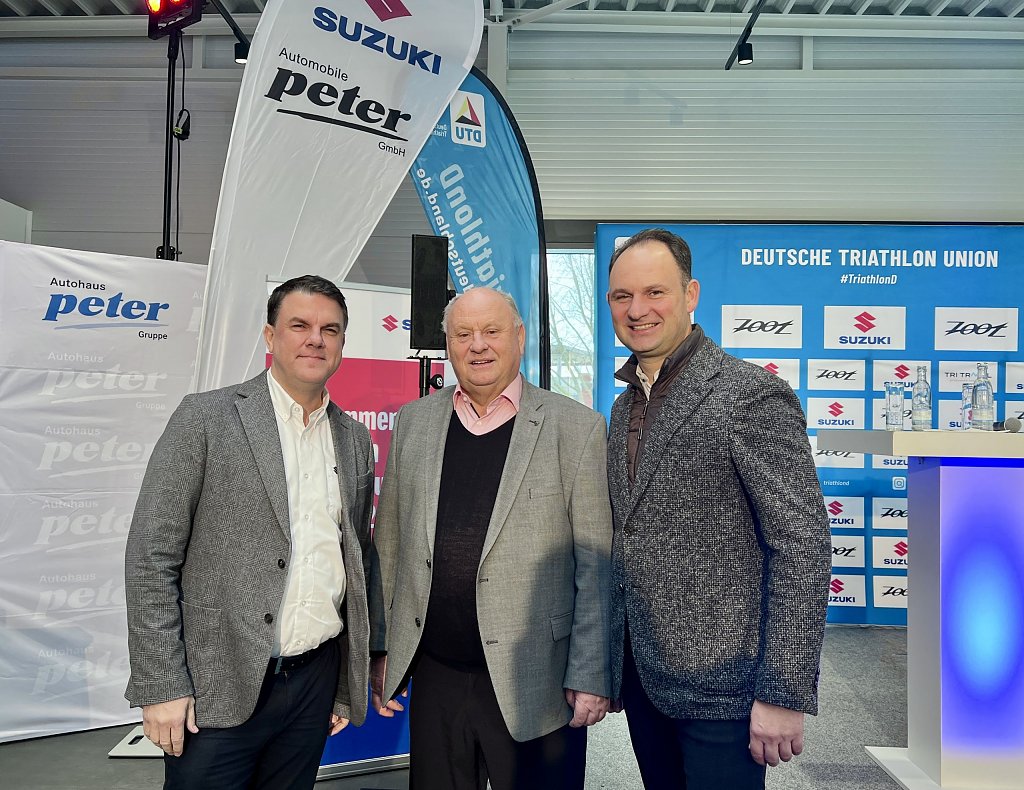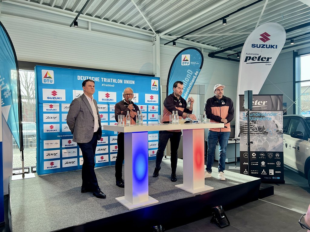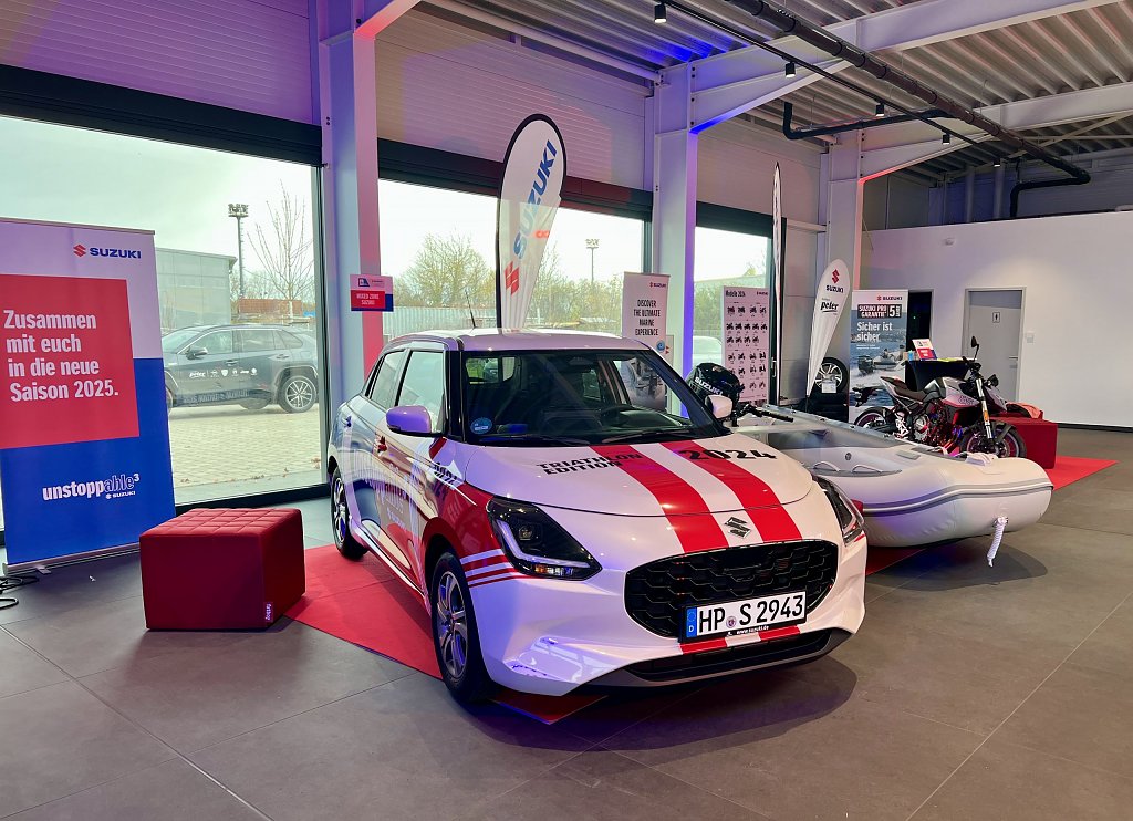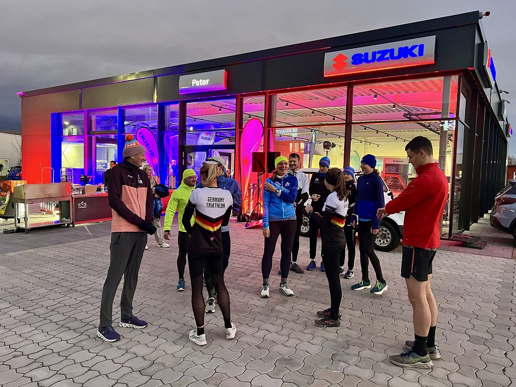 Und so kam es, dass sich am 28. November in unserem nagelneuen Suzuki-Autohaus im Erfurter Norden die deutsche Weltspitze dieser Sportart und der hoffnungsvolle Nachwuchs trafen, um den Elite-Kader für 2025 zu präsentieren und gleich bei der Gelegenheit passend zu den Farben des Konzerns in Grau-Lachsrot einzukleiden. Und um seitens von Daniel Schnell, Deputy Managing Direktor — man könnte auch sagen: stellvertretender Geschäftsführer — der Suzuki Deutschland GmbH, der eigens den Weg zu uns angetreten hatte, an Ort und Stelle das Wichtigste zu verkünden: Suzuki verlängert vorzeitig den Sponsoringvertrag mit den Spitzen-Ausdauersportlern jetzt schon bis Ende 2028.