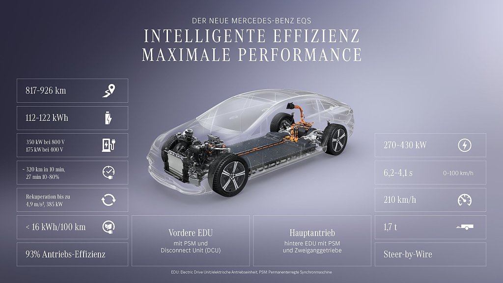 Mit einer WLTP-Reichweite von bis zu 926 Kilometern5 ermöglicht der EQS 450+ ausgedehnte Langstreckenfahrten ohne Ladestopp. Rechnerisch und auf Basis des WLTP-Verbrauchs reicht die Energie beispielsweise für die Strecke MünchenParis oder den Trip von Zürich nach Hamburg. Das bedeutet ein beachtliches Reichweiten-Plus von 13 Prozent gegenüber dem bereits sehr ausdauernden Vorgänger. Zugleich wurde die Elastizität, also die Zwischenbeschleunigung, speziell im oberen Geschwindigkeitsbereich deutlich verbessert.Diese für Kundinnen und Kunden deutlich spürbaren Verbesserungen bei Reichweite, Effizienz und Dynamik basieren auf der grundlegend neuen Elektroarchitektur, die der neue EQS erhalten hat. Dazu zählen 800-Volt-Technologie, neue, im Unternehmen entwickelte Antriebseinheiten, Zweigang-Getriebe am Hauptantrieb an der Hinterachse sowie größere Batterien mit optimierter Zellchemie. Ein weiteres großes Plus in der Praxis: Mit 1.600 Kilogramm konnte die Anhängelast der Hecktriebler mehr als verdoppelt werden. Zugleich erreicht sie fast das Niveau der 4MATIC Modelle (1.700 kg). Kundinnen und Kunden können mit ihrem neuen EQS jetzt beispielsweise auch einen Pferdeanhänger ziehen.