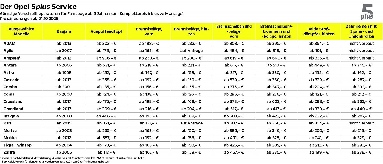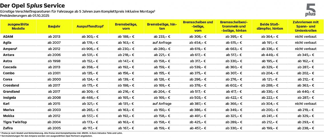 ² Die Opel 5plus Tiefpreisgarantie gilt nur bei Montage durch einen teilnehmenden Opel Partner am Fahrzeug und nur bei Verwendung von Opel Original Teilen by Mopar® oder EUROREPAR-Teilen. Voraussetzung ist die Vorlage eines schriftlichen Wettbewerbsangebots: gesondert ausgewiesene Kalkulation von Opel Original Teilen by Mopar® oder EUROREPAR-Teilen und Lohn, nicht älter als 14 Tage, Standort des Wettbewerbers innerhalb der BRD und innerhalb eines 30-km-Radius zu unserem Betrieb.