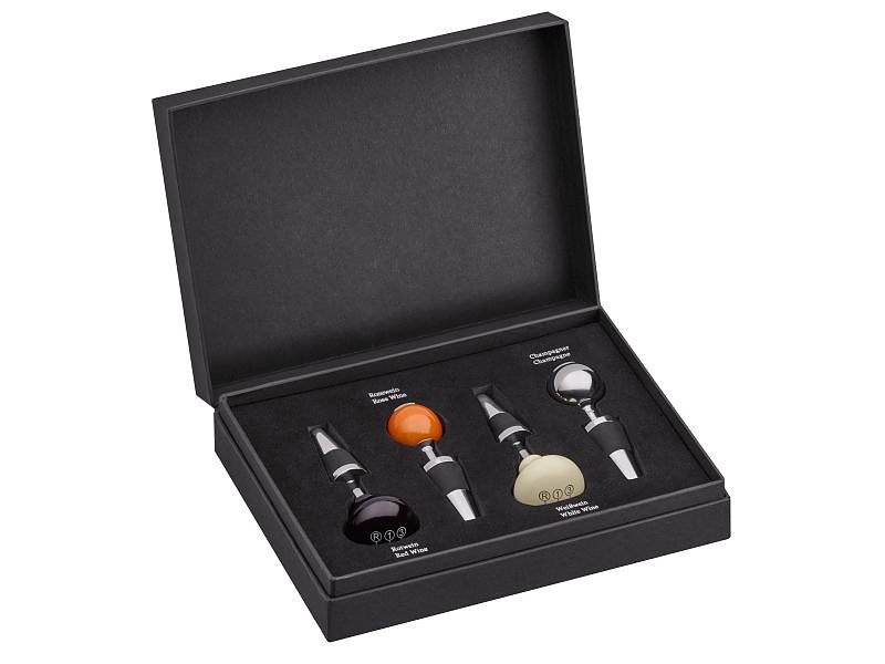 Schaltknaufs angelehnt ist. Zwei unterschiedliche Größen sind in dem 4er-Set enthalten, sodass für jede Weinflasche ein passender Verschluss bereitsteht.