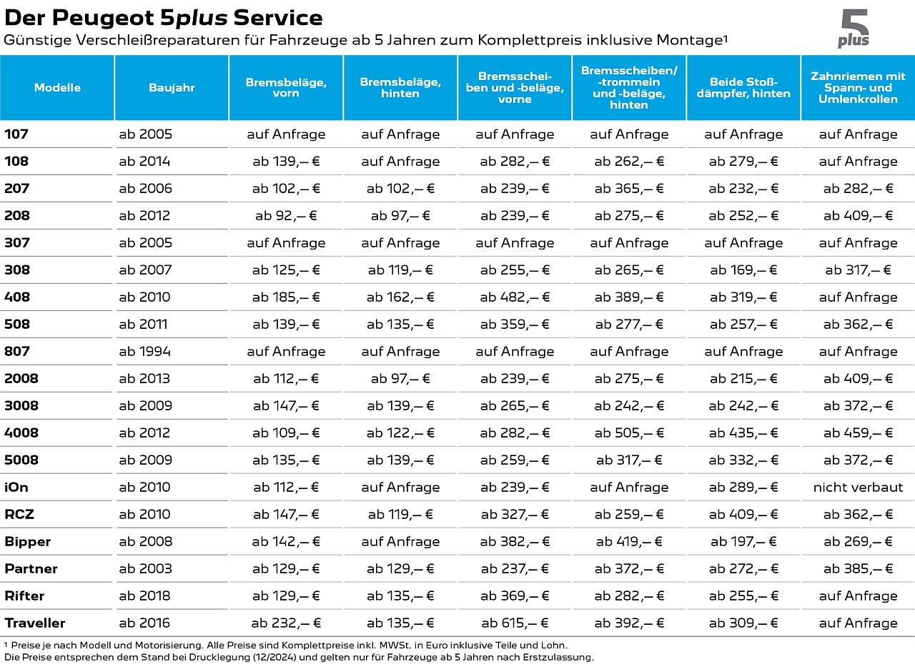 Super Preis bei Verschleiß. Wenn Ihr Auto schon ein paar Kilometer hinter sich hat, achten Sie natürlich ganz genau auf die Reparaturkosten. Mit dem PEUGEOT 5plus Service machen wir es Ihnen leichter. Für viele PEUGEOT Pkw ab 5 Jahren nach Erstzulassung erhalten Sie bei uns Top-Verschleißreparaturen inklusive Montage zu sensationellen Komplettpreisen. Damit liegen Sie immer richtig. Denn egal, ob Sie sich für eine Reparatur mit preislich reduzierten PEUGEOT Original Teilen by Mopar® oder mit dauerhaft günstigen EUROREPAR-Teilen entscheiden, in puncto Sicherheit bieten Ihnen beide kompromisslose Qualität.