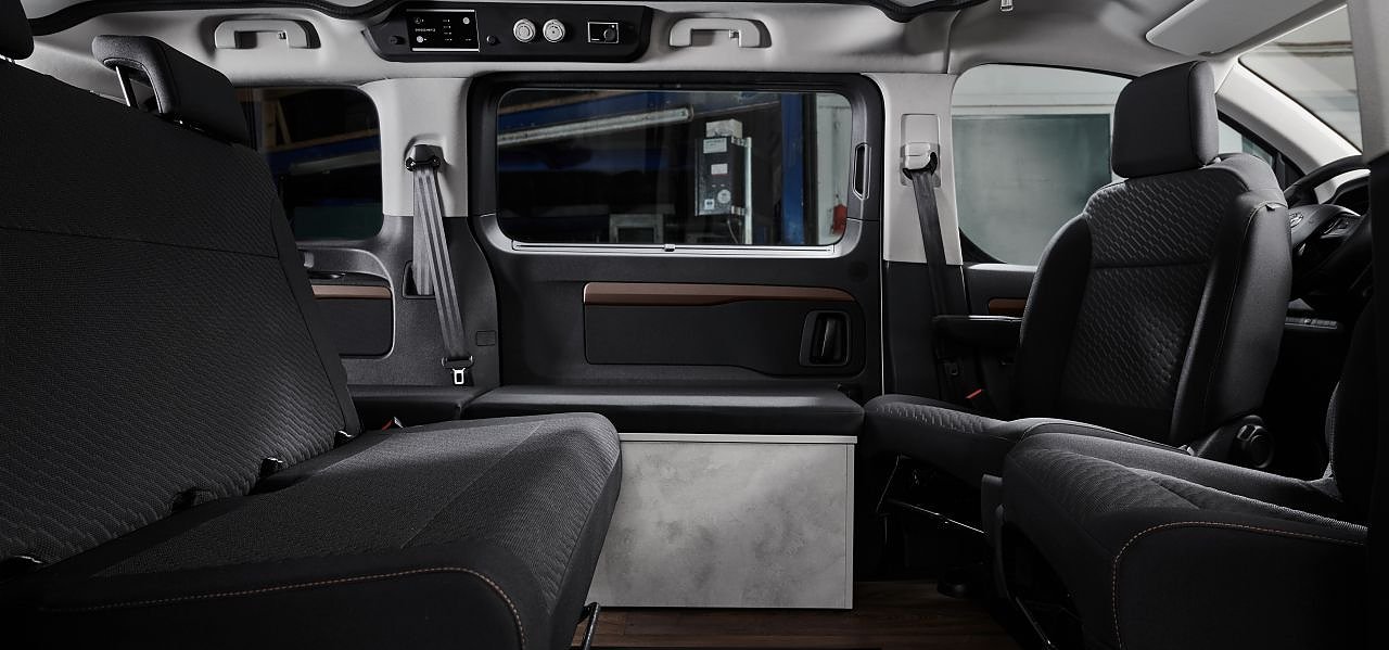 Die niedrigen Einbauten geben dem CROSSCAMP LITE ein enormes Raumgefühl und großzügigen Stauraum. Serienmäßig verfügt der CROSSCAMP über fünf Sitzplätze, optional finden sieben Reisende genügend Platz.