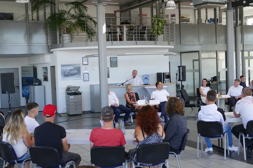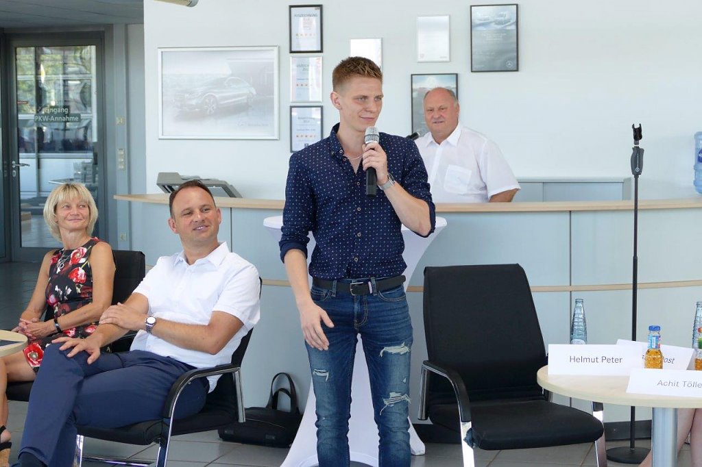 Live-Statements gaben in diesem Jahr Michel Härter (Mechatroniker-Azubi) und der frischgebackene Automobilkaufmann Moritz Arenswald ab. Moritz wird die Schulbank weiter drücken, denn er beginnt in diesen Tagen ein Studium an der Bundesfachschule in Northeim.