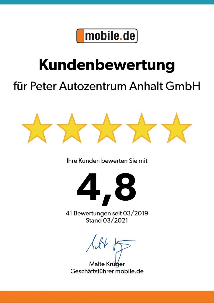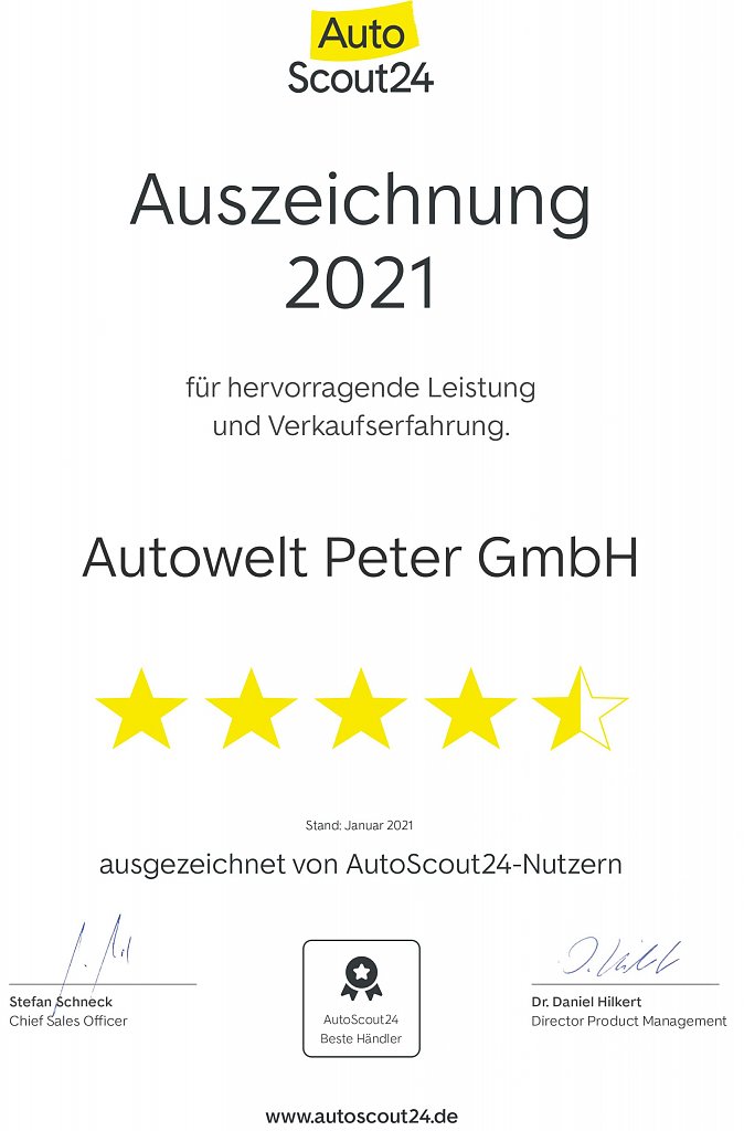 Die Autowelt Peter GmbH wurde Anfang März von Autoscout24 mit durchschnittlich 4,6 von 5 Sternen für ihren hervorragenden Service ausgezeichnet. Zudem wurde sie Anfang März auch vom Online-Fahrzeugmarkt mobile.de mit durchschnittlich 4,9 von 5 Sternen aus 39 Kundenbewertungen für ihre Leistung im Verkauf geehrt. Centerleiter Torsten Wiesner freut sich sehr über die Urkunden: "Wir sind sehr glücklich über diese Auszeichnungen und sehen sie als Bestätigung für unsere Beratung und unseren umfassenden Service an."