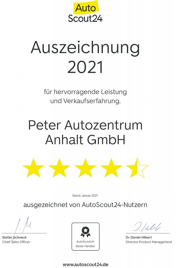 Auch die Peter Autozentrum Anhalt GmbH gehört mit durchschnittlich 4,6 von 5 Sternen zu den besten Autohäusern in Sachsen-Anhalt. Die Urkunde von Autoscout24 erhielt sie Anfang Januar für ihre Verkaufserfahrung im Transporter-Bereich am Standort Dessau.