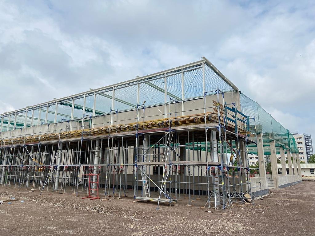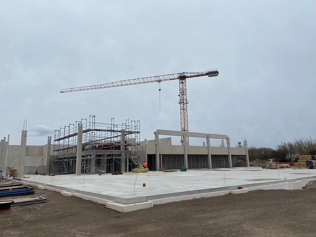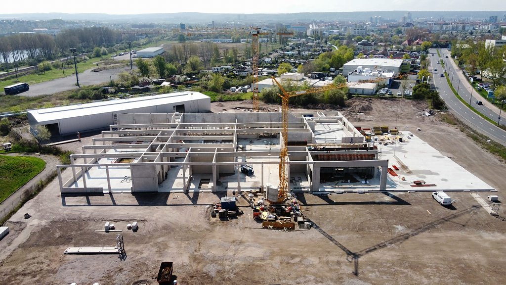Noch befindet sich auf dem Gelände in Erfurt eine Großbaustelle. Seit kurzem läuft der Hochbau für das neue Automobile Dienstleistungszentrum und die Montage aller Betonfertigteile erfolgt. Somit nimmt das neue Autohaus weiter an Gestalt an.