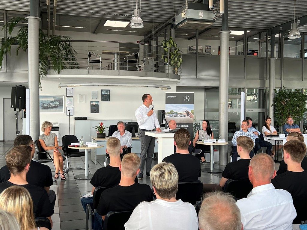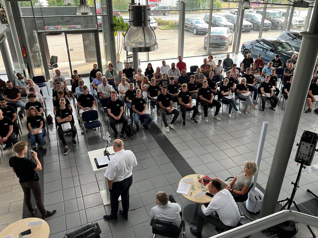 Am frühen Freitagabend hieß Helmut Peter 41 junge Menschen willkommen, von denen 28 ihre Ausbildung zum KFZ-Mechatroniker, 2 zum Lackierer und 11 zum Kaufmann für Büromanagement beginnen werden. Mit dabei: die Eltern der Neuen, die Peter-Geschäftsleitung sowie Pädagogen der Berufsschulen.