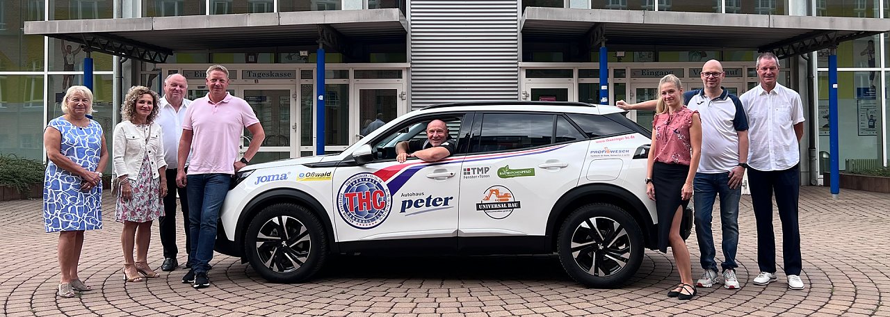 Der THC spielt weiter international in Nordhausen. Darüber verständigten sich (von links) Hannelore Haase (2. Beigeordnete Landkreis), Birgit Pommer (Präsidentin Thüringer Landtag), Helmut Peter, Robert Böhm (beide Gesellschafter), Trainer Herbert Müller (im Auto), Sybille Fiß (THC), Maik Schenk (Geschäftsführer) und Andreas Meyer (LK Sportmarketing).