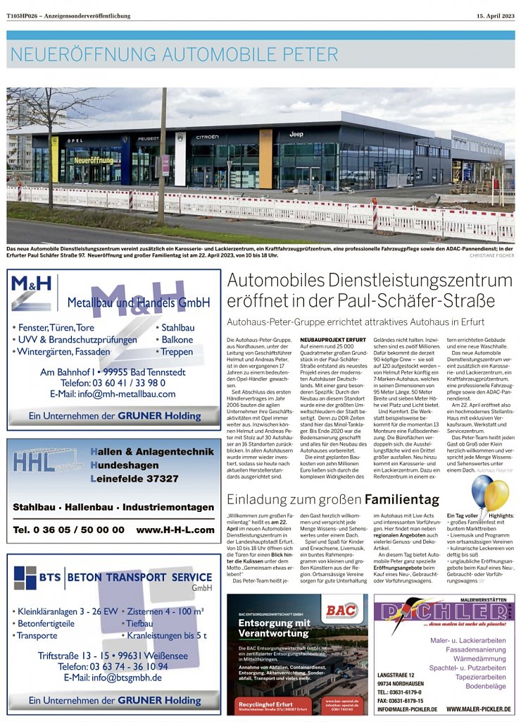 Willkommen zum großen Familientag heißt es am 22. April im neuen Automobilen Dienstleistungszentrum in der Landeshauptstadt Erfurt. Von 10 bis 18 Uhr öffnen sich die Türen für einen Blick hinter die Kulissen unter dem Motto Gemeinsam etwas erleben!Das Peter-Team heißt jeden Gast herzlich willkommen und verspricht jede Menge Wissens- und Sehenswertes unter einem Dach.