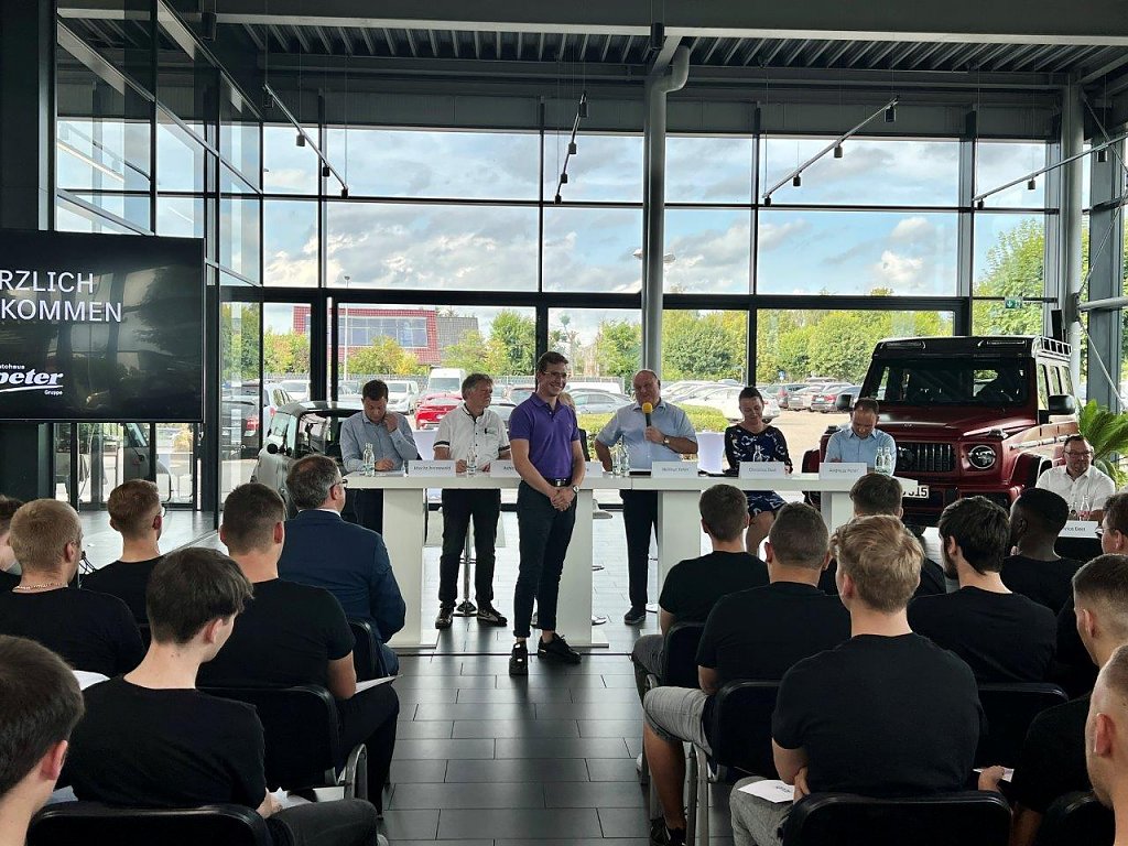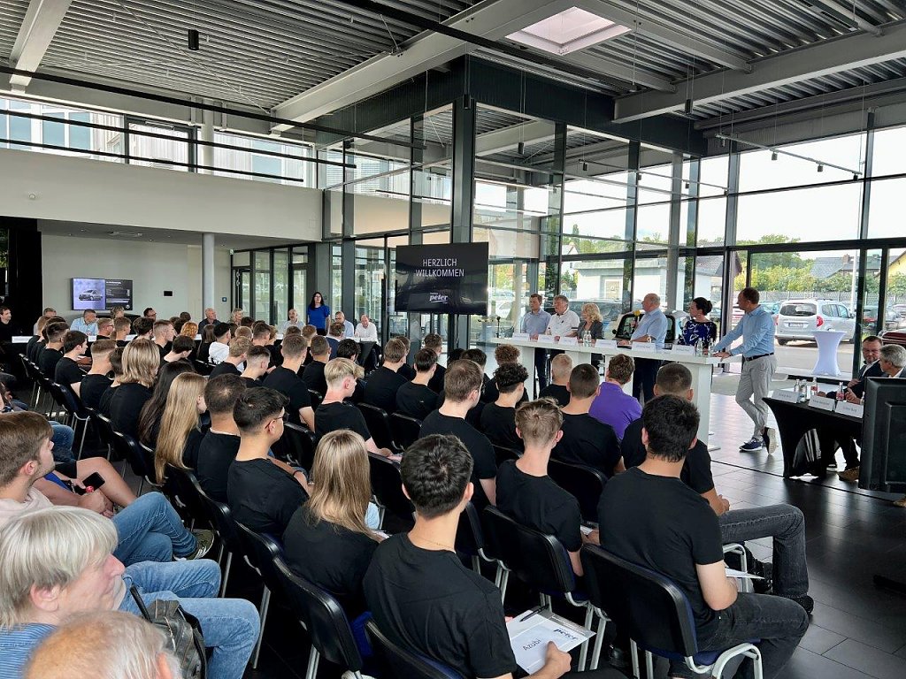 Schon bei der Begrüßung erläutern die Chefs traditionell, welche beruflichen Perspektiven sich hinsichtlich eines Studiums oder der Meisterschule bieten. Junge Peter-Mitarbeiter, die noch vor wenigen Jahren selbst in den Reihen der Neulinge saßen, berichten über eigene Erfahrungen: in der Berufsschule, bei der praktischen Ausbildung im Betrieb, bei der überbetrieblichen Lehrunterweisung, während der Meisterausbildung oder beim Studium an der Bundesfachschule für Betriebswirtschaft im Kfz-Gewerbe (BFC) in Northeim.