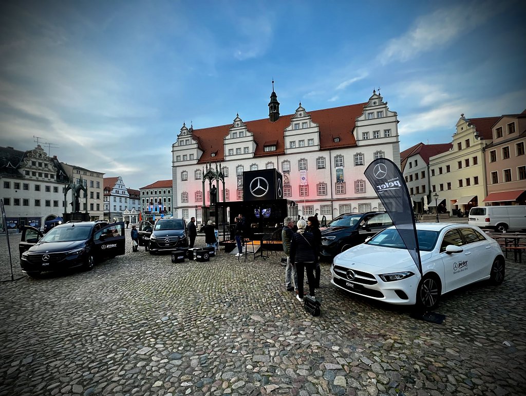 Am Event Cube Stand standen dieses Jahr vier besondere Fahrzeugmodelle im Mittelpunkt. Der GLE beeindruckte als vielseitiger Allrounder und Hingucker, während die A-Klasse mit einem attraktiven Preis großes Interesse weckte. Der geräumige EQT überzeugte als wahres Platzwunder, ideal für Familien und Reisende. Ein besonderes Highlight war der neue EQV mit seinem beleuchteten Kühlergrill, der nicht nur durch sein Design perfekt zum Ambiente passte, sondern auch als Vorreiter der Elektromobilität beeindruckte.