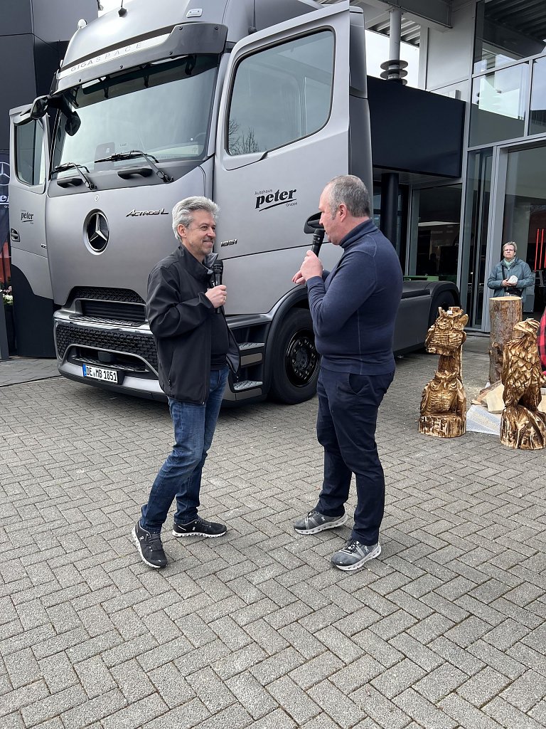 Verkaufsleiter Frank Hentschel stellte den beeindruckenden Actros vor und gab spannende Einblicke in die Welt der Fernfahrer. Spannend wurde es auch in der Werkstatt: Serviceleiter Enrico Dost erklärte technische Finessen im Inneren der Fahrzeuge, die im normalen Betrieb hinter Blech und Verkleidung unsichtbar bleiben. Ein echtes Schmuckstück war dabei ein historischer Adenauer-Oldtimer, bei dem die Besucher auch unter die Motorhaube blicken konnten. Ebenso beeindruckend präsentierte sich ein zerlegter Vito, dessen komplett ausgebauter Motor für staunende Gesichter sorgte.Gute Stimmung trotz Regenschauer
