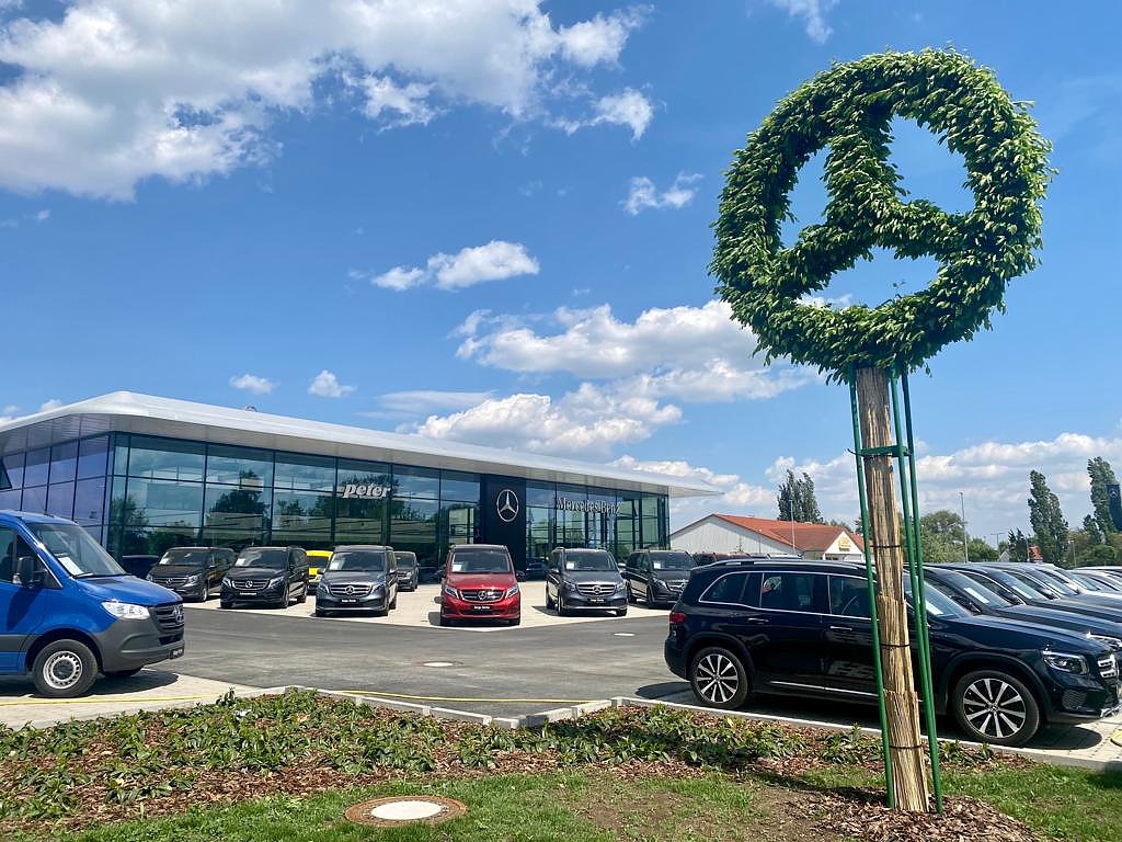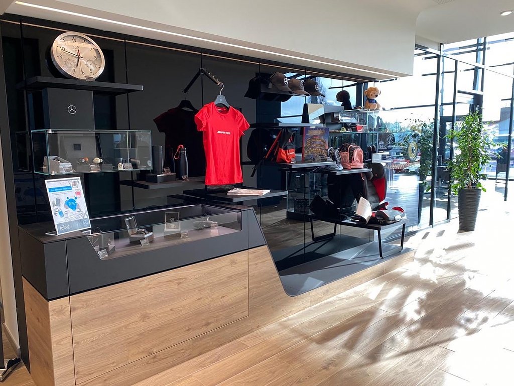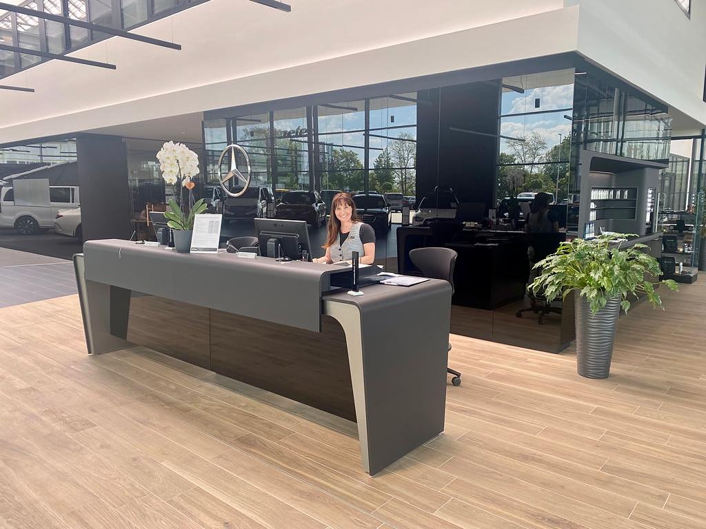 Nach modernster Mercedes-Benz-Markenarchitektur, bei der die Farbe BLACK, riesige Bildschirme (Screens), Multimedia und digitale Interaktion dominieren, wurde dem Verkauf und dem Service für Pkw, Transporter und Nutzfahrzeuge auf rund 4400 m² Nutzfläche ein zukunftsweisendes Domizil gegeben. In seiner architektonischen Konzeption trennt es konsequent die Sparten Pkw/Van und Truck (Nutzfahrzeuge).